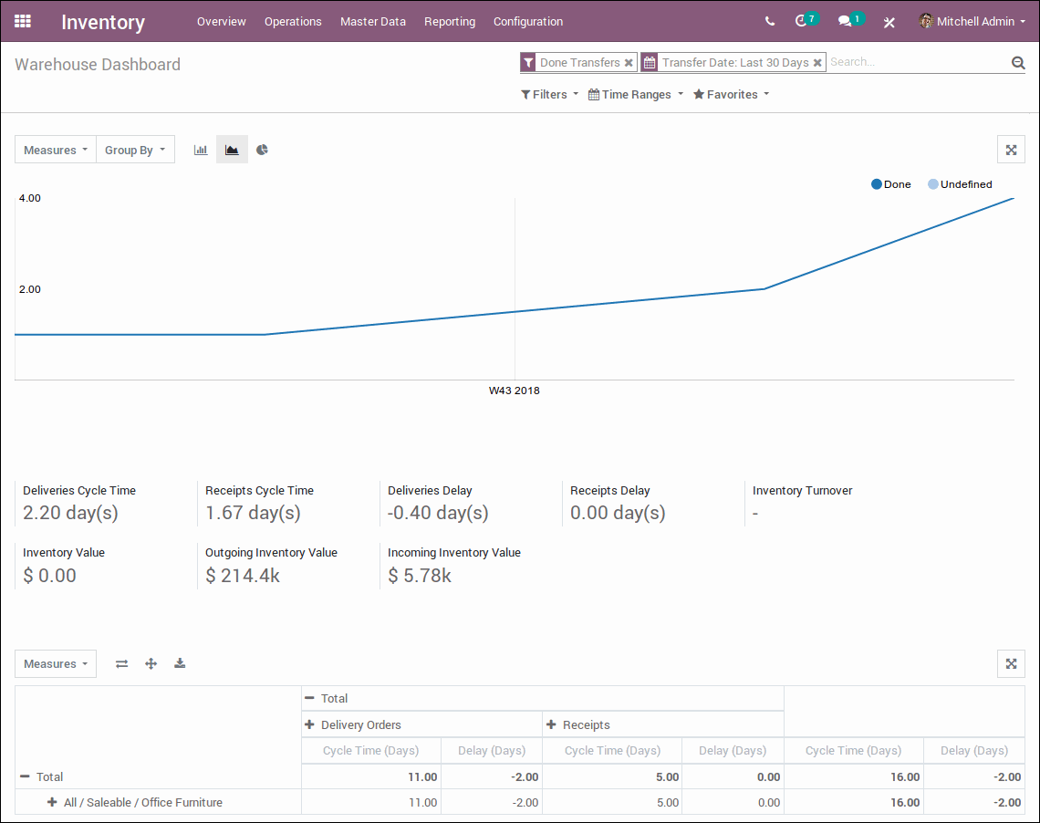 Sur le tableau de bord Inventaire, par exemple, des indicateurs par défaut permettent de connaître le délai moyen de livraison à compter de la validation de la commande client, ainsi que le temps moyen pour s’approvisionner à compter de la validation du bon de commande. Des indicateurs standards permettent également de visualiser les retards de livraison et réception fournisseurs.