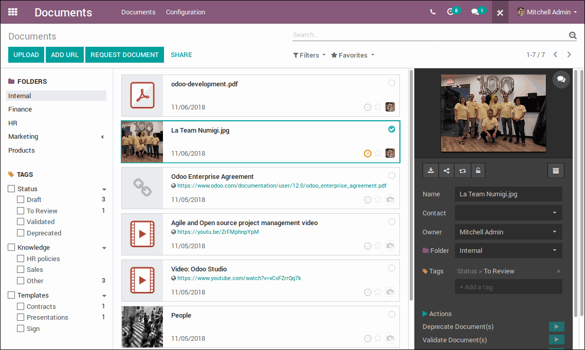 Une application de gestion documentaire fait son entrée dans Odoo, avec gestion d'arborescence, gestion des permissions d’accès aux répertoires, partage de document, demande de document ou de signature, gestion d'étiquettes et d’actions. Bien maîtrisée, cette application apportera beaucoup de fluidité dans la gestion quotidienne.