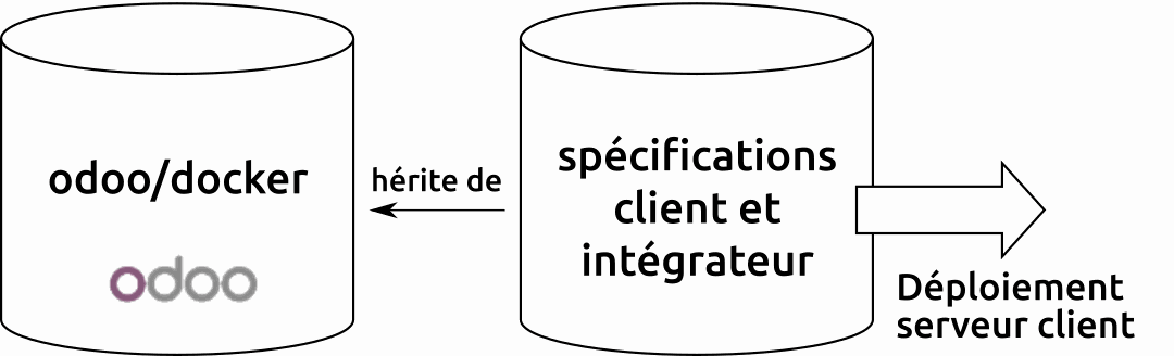Odoo/docker est l’image officielle distribuée par Odoo SA. Le conteneur vient avec sa version du code et est mis à jour, disons-le, sporadiquement. L’utilisation de cette image amène à une pipeline très classique de docker. L’image mère contient le “code” nécessaire pour rouler la solution et les images filles embarqueront des spécificités de l'intégrateur, puis celles du client, par exemple.