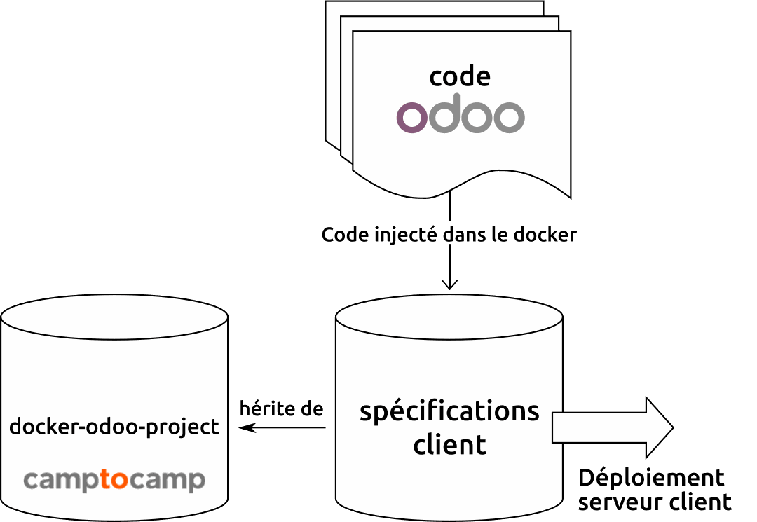 L’image, camptocamp/docker-odoo-projet, comprend quelques outils pour aider au développement, mais elle reste agnostique du côté du code Odoo. Celui-ci est injecté au niveau de l’image spécifique au client.